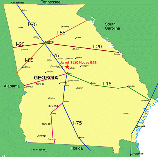 The Jarrell 1920 House is in the heart of Georgia, 16 miles east of I-75 Forsyth, next to the Jarrell Plantation State Historic Site, and near the village of Juliette, movie set of "Fried Green Tomatoes."